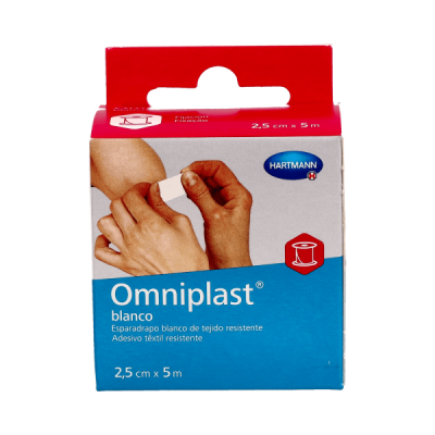 El rollo de esparadrapo de 5 metros de largo por 2,5 cm de ancho está realizado en caucho sintético con el exclusivo tejido Omniplast. Altamente resistente, tiene una gran adaptabilidad. Es apropiado para sujetar apósitos en cualquier parte del cuerpo, incluidas las articulaciones, ya que se adapta bien a las zonas móviles. Se utiliza también para sujetar sondas, cánulas, catéteres y apósitos primarios. Tiene una gran fijación inicial. Es hipoalergénico, transpirable y puede quitarse sin dolor, no dejando residuos de pegamento sobre la piel.