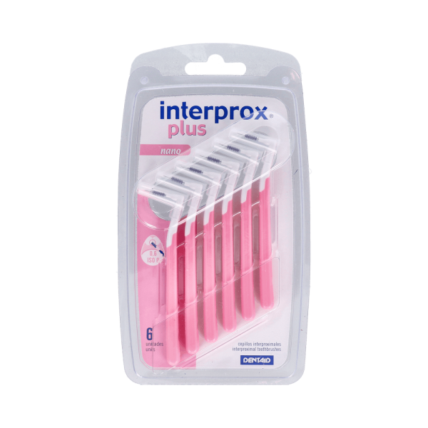 Deshazte de la suciedad que se acumula entre los dientes con el cepillo interdental plus nano de Interprox, un cepillo diseñador para eliminar el biofilm oral (placa bacteriana) acumulado en los espacios interproximales de 0,6mm, concretamente de la zona premolar o molar.