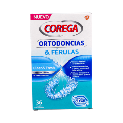 Pastilla para la limpieza de aparatos dentales de la marca Corega. Son pastillas que ayudan a mantener la higiene de los aparatos dentales, para conservar su utilidad y apariencia fácilmente. Disminuyen los malos olores que pueden absorber estos aparatos al utilizarlos varias veces y devuelven el color original de las piezas. Ideal para utilizarlo al limpiar ortodoncias invisibles, férulas de descarga, retenedores y alineadores. También pueden ser empleadas para la limpieza de protectores bucales deportivos. Su uso práctico y sencillo posibilita que se utilicen en la comodidad del hogar para cuidar la higiene de los aparatos dentales. Se tiene que disolver la pastilla en suficiente agua para que cubra el aparato dental. Posteriormente, sumergir la pieza dentro del líquido y dejar reposar de 3 a 5 minutos. Retirar del envase y cepillar la pieza hasta concluir su limpieza.