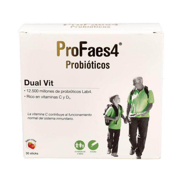 Profaes4 Dual Vit 30 Sticks se trata de un simbiòtico que contribuye al funcionamiento normal del sistema inmunitario y ayuda a disminuir el cansancio y la fatiga. Entre sus componentes se encuentran los frutooligosacáridos, unos prebióticos que ayuda a aumentar el número de Bifidobacterias en el colon. Además, ayuda al sistema inmunitario intestinal, donde la mucosa intestinal constituye un punto de inflexión para actuar de eficazmente sobre el sistema inmunológico de todo el organismo. Es especialmente útil en situaciones donde las defensas están más expuestas: períodos de convalecencia tras alguna enfermedad, períodos de sobre esfuerzo o de cansancio y fatiga.