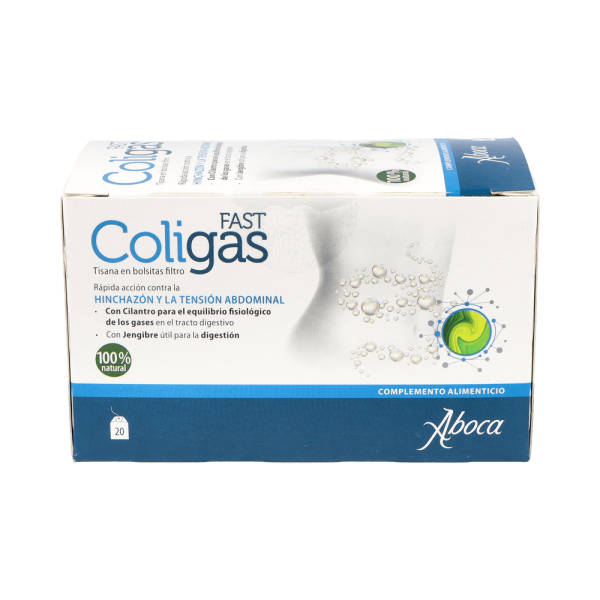 Coligas Fast 20 Bolsitas Filtro ayuda a equilibrar los gases en el tracto digestivo y facilita la digestión. Viene en una presentación de bolsitas para preparar una infusión. Está elaborado con un complejo activo natural llamado PhenoAct, que se elabora con cilantro y jengibre. El cilantro equilibra los gases en el tracto digestivo y el jengibre ayuda a mejorar la digestión.