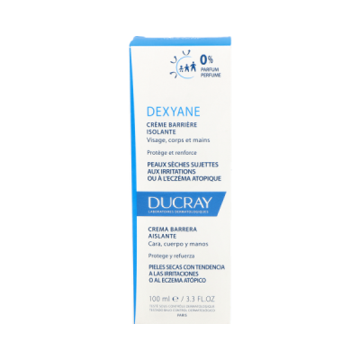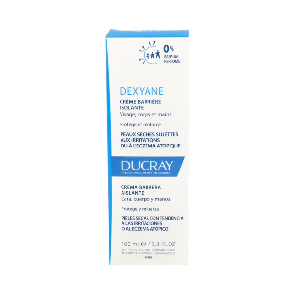 Esta crema de la marca Ducray Dexyane sirve como un tratamiento para pieles delicadas, ya sea del rostro, cuerpo o incluso manos, que sufren de irritaciones permanentes. Al utilizarse la crema en el área afectada crea una berrera protectora. Esta favorece el aislamiento de la piel a los agentes dañinos que pueden llegar a ocasionar lesiones atópicas, ya sean por materiales alérgicos, roces o sustancias desfavorables como detergentes. Esta película logra resistir incluso cinco lavadas, potenciando la hidratación profunda y duradera. No contiene ningún tipo de perfumes y tiene una textura suave y delicada que al momento de usarla deja una capa invisible pero resistente. También es de gran ayuda para disminuir las reacciones alérgicas. Además, su fórmula altamente tolerable es apta para bebés mayores de tres meses, niños e incluso adultos.