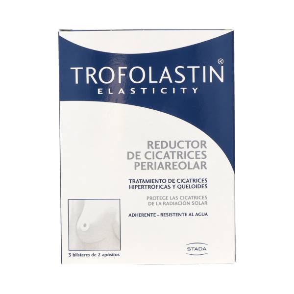 Trofolastín Reductor Cicatrices Perioareolar 3x2uds está indicado para la reducción de cicatrices de carácter hipertrófico, ya sea reciente o antigua, o bien en caso de queloides periareolares. Formado por dos capas: una superficie externa con una membrana de poliuretano microporoso y una interna que incluye una película acrílica que permite la fijación fácil y cómoda en la piel, este producto está indicado para las cicatrices producidas por aumento de mamas a través de la vía periareolar. Asimismo, también protege las cicatrices del daño solar.