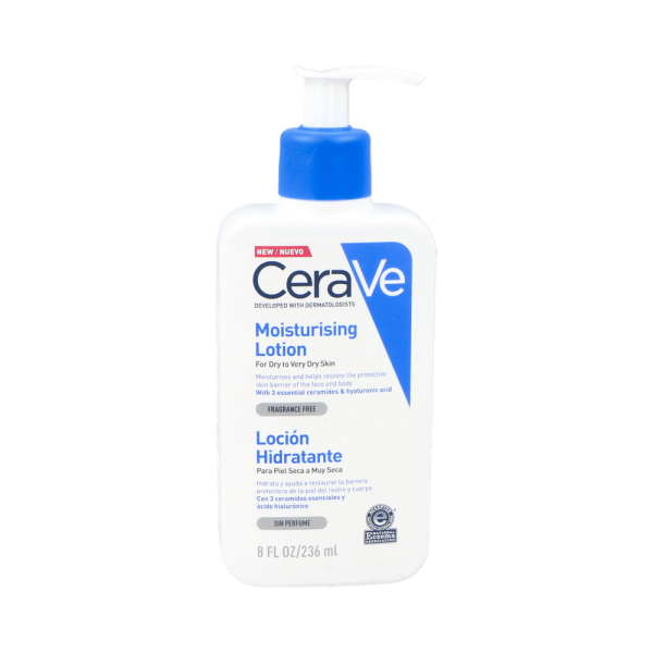 CeraVe Loción Hidratante 236ml es una loción que proporciona una hidratación ligera y ayuda a reparar la barrera protectora natural de las pieles secas y muy secas, tanto en el rostro como en el cuerpo. Su fórmula ligera y no grasa ha sido diseñada por dermatólogos y combina tres ceramidas esenciales, ácido hialurónico y niacinamida. Esta combinación, junto con la tecnología MVE, calma la piel, prolonga la hidratación durante todo el día y protege la barrera natural de la dermis. Además, al no contener perfumes se puede usar también en el cuidado diario de las pieles sensibles.