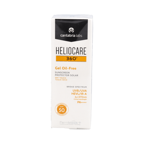 Heliocare 360º SPF50+ Gel Oil-Free 50ml es un protector solar que presenta una amplia cobertura frente a los rayos UVA y UVB.Gracias a su formulación, posee una textura gel ultraligera y totalmente libre de grasas. Ofrece una rápida absorción y un excelente acabado sin aspecto blanquecino y sin brillos.Además, ayuda a prevenir el fotoenvejecimiento prematuro y la aparición de imperfecciones sobre la piel, mientras que deja la piel suave y lisa, con su acción seborreguladora y matificante. Está indicada para todo tipo de pieles, especialmente para pieles grasas.