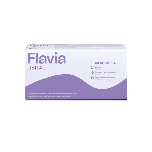 Flavia Libital es un complemento multifuncional diseñado para apoyar el bienestar femenino durante la menopausia. Ayuda a estimular la libido, reducir los sofocos y la sudoración nocturna, mejorar el descanso, combatir la fatiga y favorecer el equilibrio emocional y la salud ósea. Su fórmula combina ingredientes naturales como isoflavonas de soja, lúpulo, fenogreco, azafrán, melatonina y vitaminas B y D. Además, es sin gluten, sin lactosa y bajo en azúcares, apto para mujeres con intolerancias alimentarias.