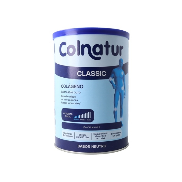 Colnatur Classic Sabor Neutro es un producto elaborado a base de proteína colágeno hidrolizada (natural, muy asimilable y pura), así como vitamina C la cual contribuye a la formación normal de colágeno para el funcionamiento normal de los cartílagos. Su fórmula contribuye a la formación normal de colágeno para el funcionamiento normal de los huesos, y ofrece protección de las células frente al daño oxidativo.