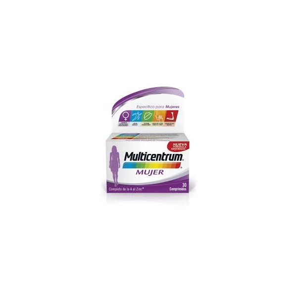 Multicentrum Mujer es un suplemento multivitamínico que te aportará un soporte nutricional específicamente pensado para mujeres a partir de 18 años. Su fórmula está basada en calcio, hierro y ácido fólico, estos principios activos colaboran en el mantenimiento adecuado de los huesos, en la formación normal de los glóbulos rojos y la hemoglobina y en el proceso de la división celular. ¿Qué beneficios aporta Multicentrum Mujer? Libera energía al metabolismo energético normal. Favorece el sistema inmunitario. Aporta salud a la piel, cabello y uñas. Ayuda al mantenimiento de calcio en sangre y huesos. Favorece el funcionamiento normal del organismo de las mujeres.